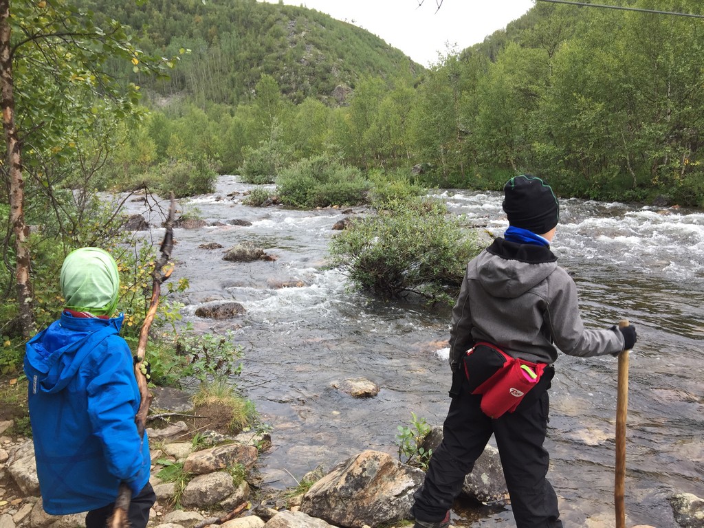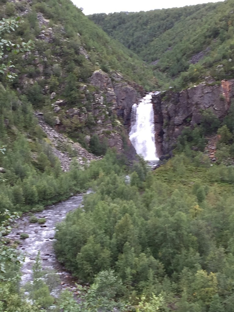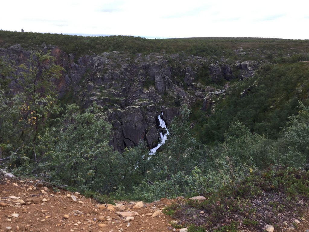Päädyimme katsomaan putousta kauempaa. Joki virtasi melko voimakkaana virtana ja sen ylitys tuntui tosiaan meidän porukalle olevan liian suuri saavutus. Yksi unelma oli kuitenkin toteutunut: Saimme nähdä Fiellujoen putouksen. Palasimme illasta samaa reittiä takaisin telttapaikalle.