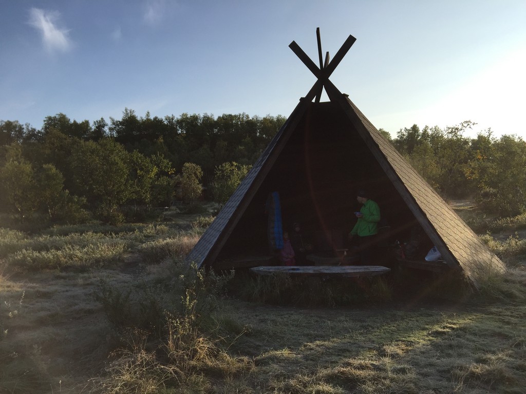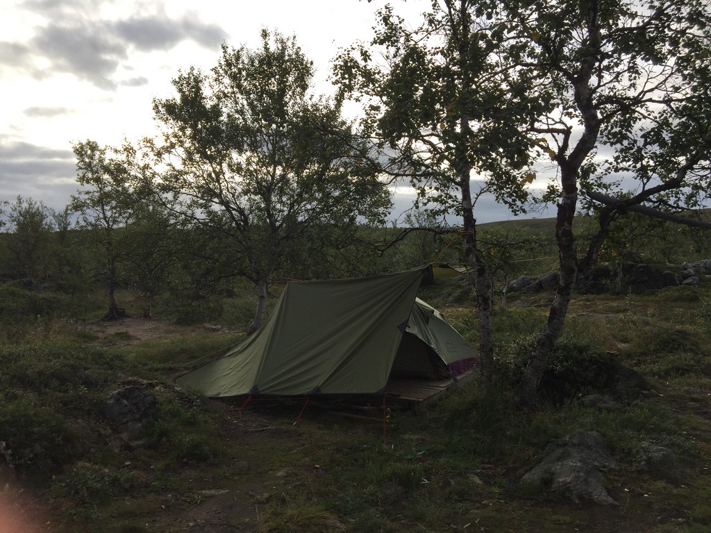 Suohppasajalla meitä odotti valmiiksi lämmitetty kota, jossa saimme kuivatella vaatteet ja kengät. Sadekin loppui illan aikana. Yövyimme teltassa. Paikassa oli pari muutakin telttaa.